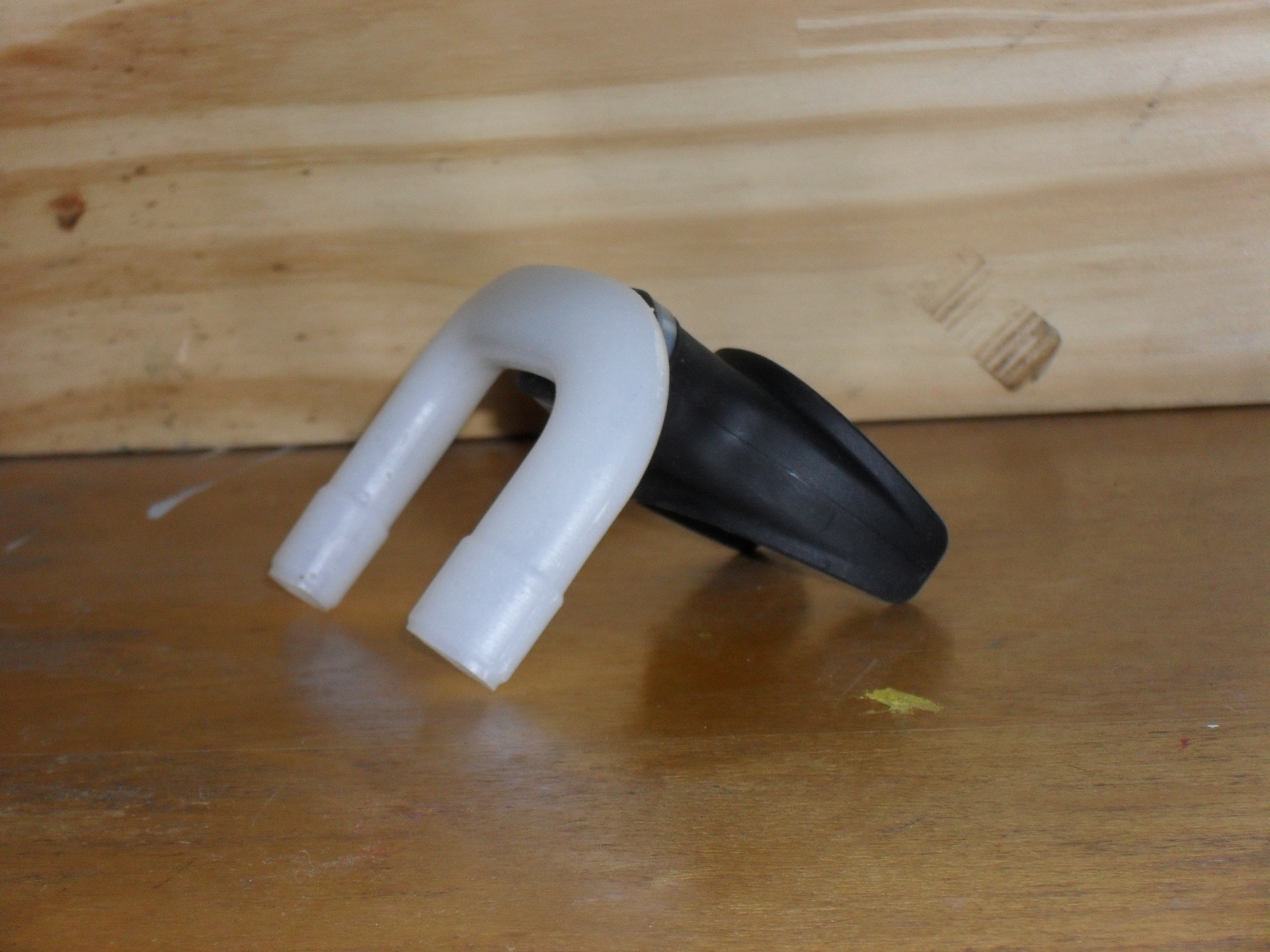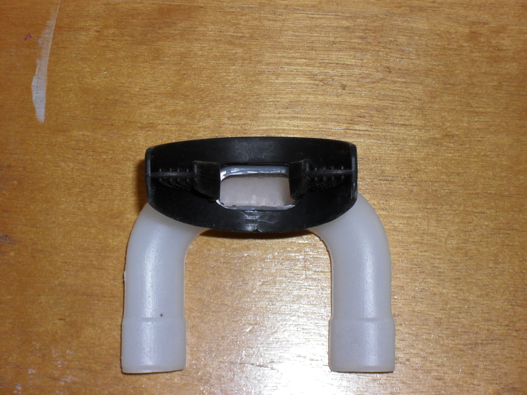 Yesterday when I got home from the office a fedex package from Montie Design the firm that is helping to develop and market this product, was waiting for me with two samples of the Fog Thief. It is a very simple design, imagine if you will an upside down snorkel. The mouth piece seems to be directly modeled from a scuba mouth piece, but instead of a hose leading to a tank there is a u shaped plastic snorkel that simply points down and out of`the bottom of your lid. Such a simple seeming idea you wonder why you have never seen it before.